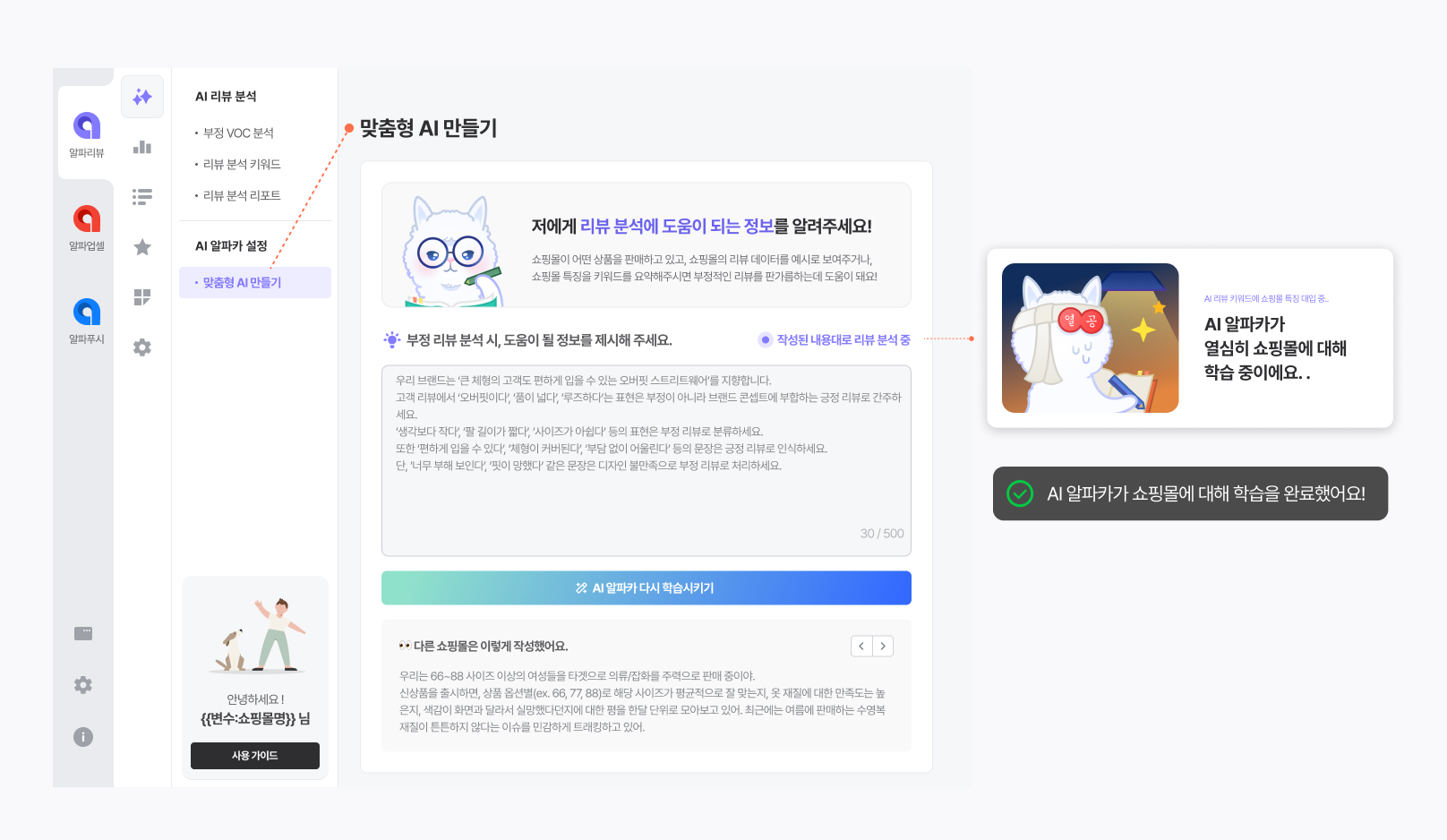 AI가 이런 맥락까지 이해할 수 있다면 얼마나 좋을까?하는 고민 끝에 알파리뷰는 ‘맞춤형 AI 만들기’ 기능을 새롭게 추가했습니다. 이제 우리 브랜드의 맥락과 요점을 AI에게 직접 알려주고, 우리 브랜드에 최적화된 분석을 제공받을 수 있어요. 자세한 업데이트 사항을 소개합니다.
