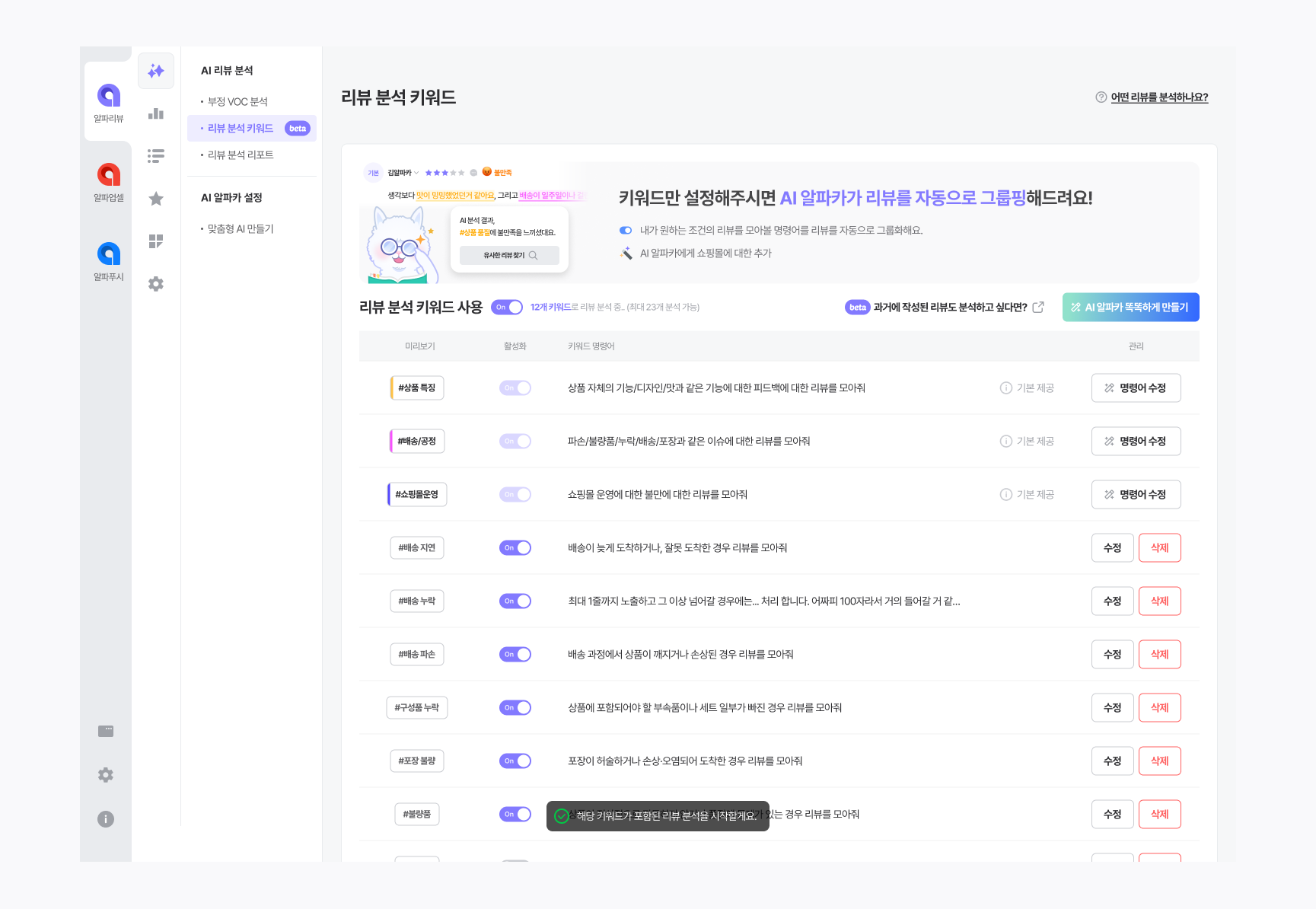 알파리뷰 AI 기능을 활용해 보세요.