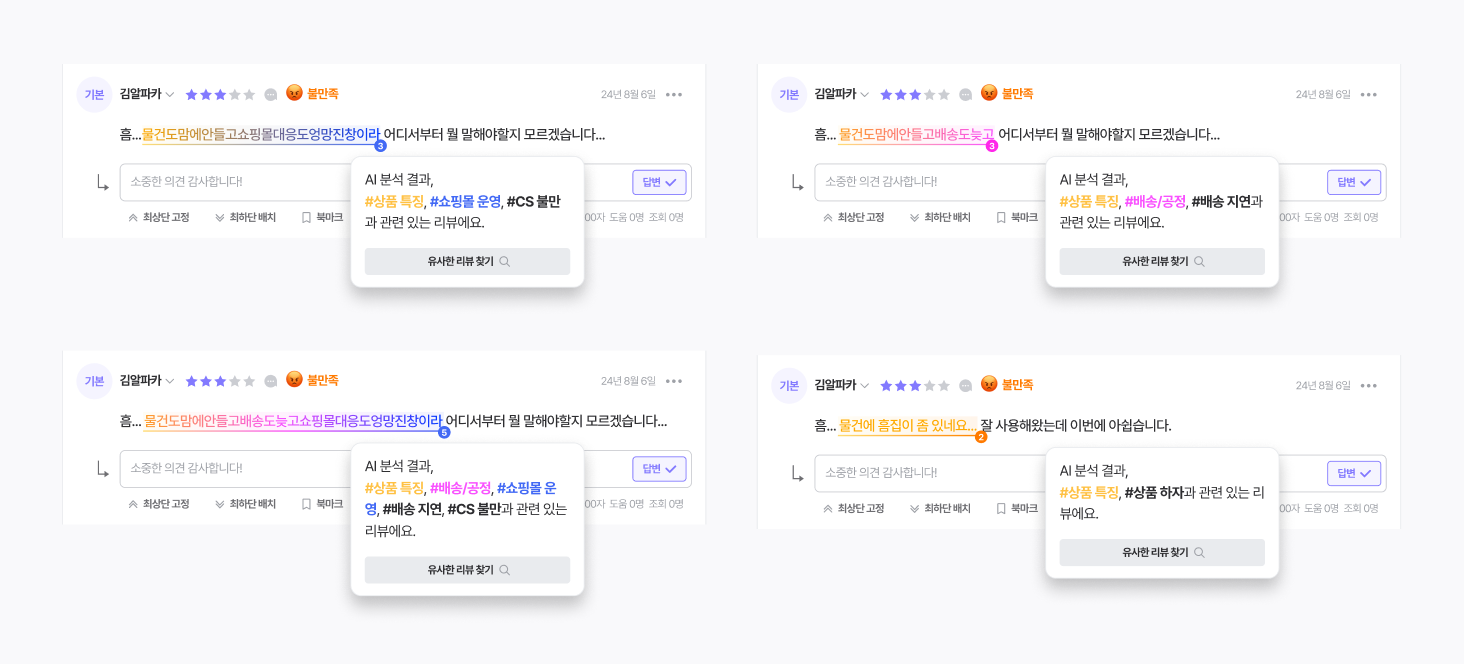 AI 키워드 분석을 설정해두면, 리뷰를 확인할 때 리뷰 내용에 대한 태그들이 하이라이트 표시됩니다. 쇼핑몰이 설정한 태그에 따라 색상이 표시되기 때문에 어떤 주제의 리뷰인지 한눈에 확인 가능해요.