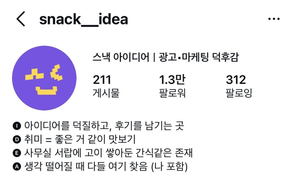 '광고 건너 뛰려다 걸려 넘어진 대학생'이라는 프로필의 한 줄 소개 마저 임팩트 있는 계정입니다. 카피라이팅에 특화된 계정으로 좋은 카피라이팅을 소개하기도 하고 계정주가 직접 쓰기도 합니다. 직접 작성한 헤드 카피는 약 140여편 정도라고 하는데요. 이 노력이 통했는지 좋아요가 단일 피드 3.2만개나 찍히는 기록을 세우기도 했습니다. '확실한 알리BUY - 알리 익스프레스', '과하지 않은 향기로 너에게 기억되는 것, 그게 가장 나다우니 - 다우니', '아버지 이제야 꽤 달아요 - 백세주', '죽도 밥도 다 된다 - 본죽 & 본도시락' 등 기발하고 반짝이는 카피로 멈춰있는 머리에 환기를 줍니다. 직접 쓴 카피 뿐만 아니라 해외 캠페인, 콜라보, 프로모션도 소개하고 있으니 계정주만의 인사이트가 궁금하시다면 찾아보시길 권합니다.