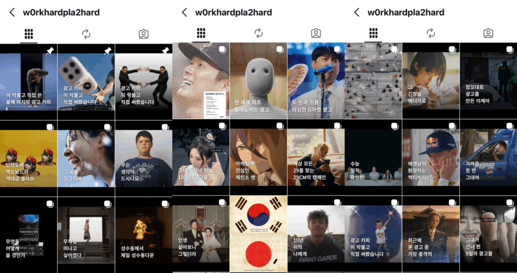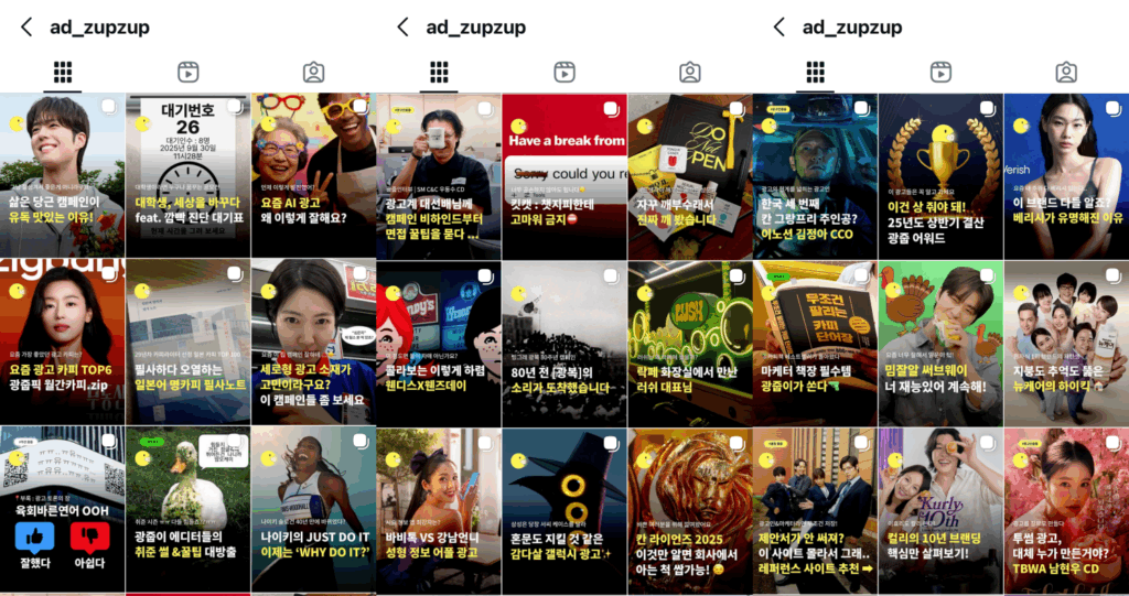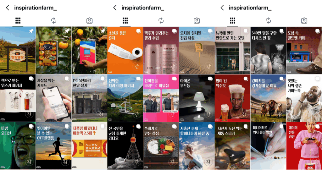 썸네일을 통일시켜 피드 전체의 비주얼 감도가 매우 높습니다. 이곳은 일상에서 직접 수집한 레퍼런스에 계정주의 짧은 감상과 솔직한 의견을 더해놓는 것이 특징입니다. 딱딱한 정보 제공이 아니라, 친구와 이야기를 나누는 듯한 코멘트를 읽으며 편안하게 인사이트를 얻을 수 있습니다. '귀엽거나 사소하거나 작은 일상 속 영감 한 꼭지들', '타겟의 어떤 순간을 포착하느냐가 곧 메시지의 힘'과 같은 주제로 인쇄 광고 등을 깊이 있게 바라보며 코멘트를 남기는데, 주제 선정부터 깊은 고민과 통찰을 담아내려 노력하는 것이 느껴집니다. 구독자들의 영감 제보에도 적극적으로 코멘트를 달고, 업무 꿀팁도 나누는 등, 현재 업무가 막혀 있을 때 응용해볼 수 있는 노하우나 레퍼런스가 가득한 커뮤니티형 보물 같은 공간입니다.