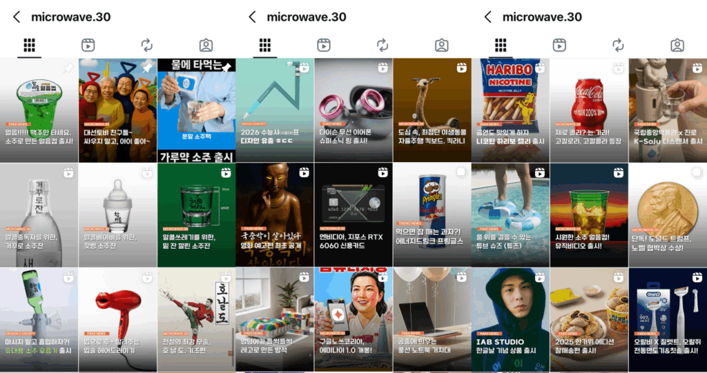맥주를 부으면 바로 소맥이 완성되는 '소주로 만든 얼음컵' 아이디어나, 물에 타 먹는 '가루 소주' 출시, 먹으면 잠 깨는 과자 '프링글스 레드불'처럼 이마를 탁 치게 하는 기발한 아이디어를 제시합니다. 저는 처음 이 계정을 봤을 때 실제로 출시가 된다는 줄 알고 깜빡 속을 정도였는데요. 이처럼 높은 현실감을 주는 것은 계정이 인스타그램 매거진 포맷을 차용하고 있기 때문입니다. 덕분에 콘텐츠의 완성도와 현실 싱크로율이 매우 높은 편이죠. 주로 기존 제품을 비틀거나 두 가지 아이템을 섞어 새로운 기획을 만드는 발상을 보여주며, 기발한 크리에이티브가 필요할 때 잠시 머물러 발상의 전환에 빠져보시는 것을 추천합니다.