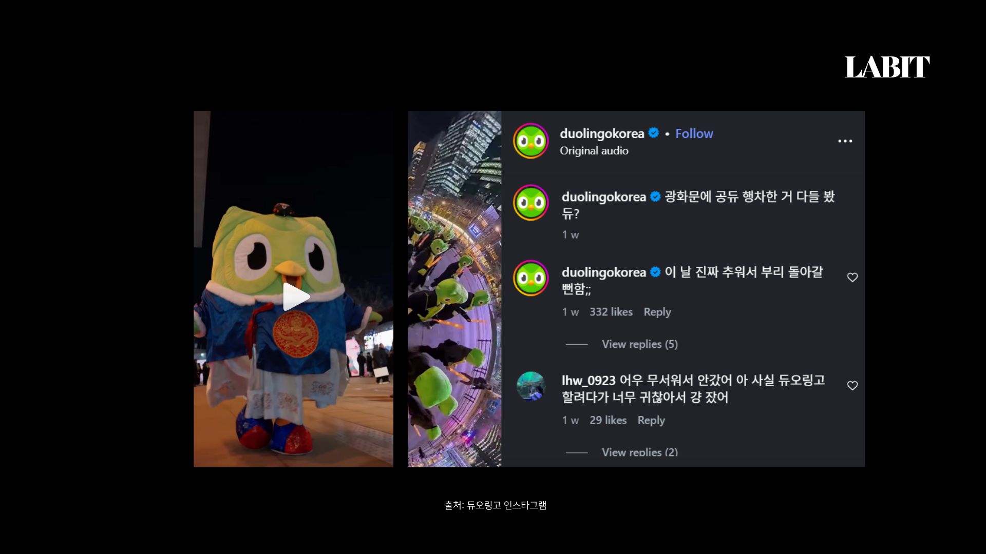 2025년 12월 31일, 서울 보신각. 새해를 기다리는 인파 사이로 거대한 초록 부엉이가 나타났어요. 듀오링고의 마스코트 '듀오'였죠. 듀오링고 코리아 공식 Instagram에는 "광화문에 공듀 행차한 거 다들 봤듀?"라는 게시물이 올라왔고, 해당 피드는 난리가 났죠. "이 날 진짜 추워서 부리 돌아갈 뻔함;;" 이라는 듀오링고 공식 계정의 댓글부터, "500일 안 했는데 이 날 갔으면 큰일 날 뻔"이라는 유저의 우스갯소리까지.